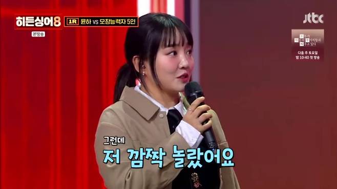 통 안에서 첫 '히든싱어'를 체험한 윤하는 "아홉 번 마음 다치고 한 번 웃었다. 저 깜짝 놀랐다. 이분들이 계속 위협적일 것 같다. 지난날의 윤하를 만나는 느낌이었다. 거쳐왔던 목소리가 들려서 신기했다"는 소감을 전했다.