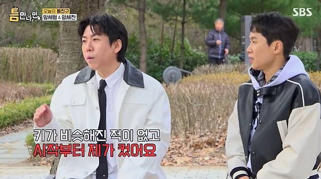 유연석이 "그래도 키가 비슷해질 때쯤 반항하지 않냐"고 묻자 양세찬은 "키가 비슷해진 적 없고, 시작부터 제가 컸다"고 말해 웃음을 자아냈다. 양세찬은 "그때부터 형이 자격지심이 있었다. '왜 내가 형인데 키가 작지'라면서 세지려고 했다"고 덧붙이기도.