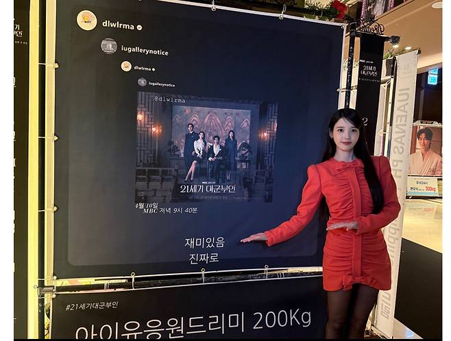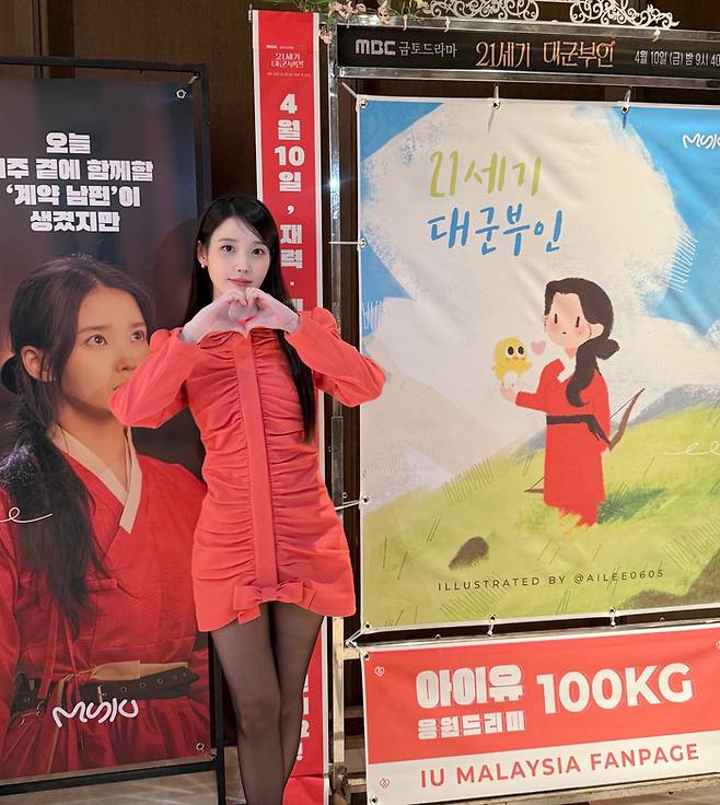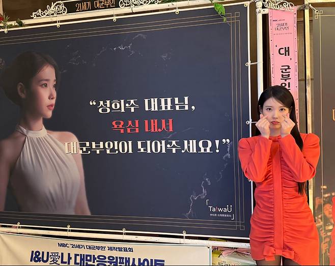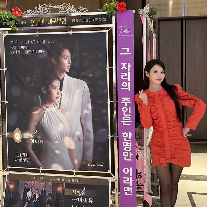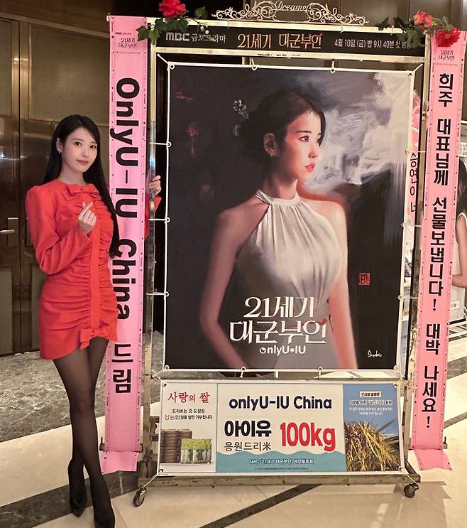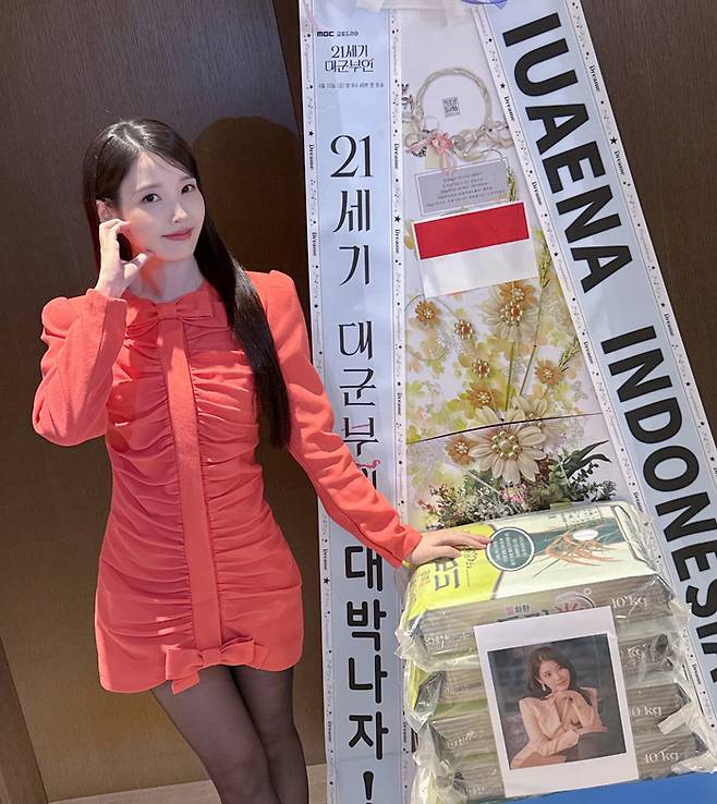 사진 속 아이유는 극 중 캐릭터인 ‘성희주’를 연상시키는 화사한 오렌지 레드 컬러의 미니 원피스를 입고, 팬들이 보내준 쌀 화환과 응원 배너 앞에서 다양한 포즈를 취하고 있다.