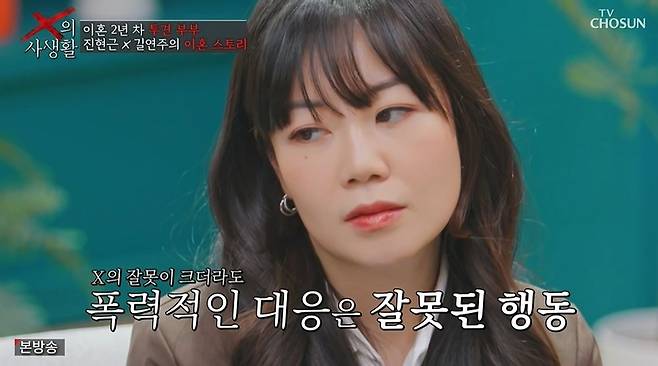 이에 김구라가 "큰 잘못은 전남편이 한 게 맞다. 근데 계속 괴롭히고 술을 마시니까 '이혼숙려캠프'(이하 '이숙캠')에서 뭇매를 맞은 것 같다"고 하자 길연주는 "맞다. 저도 똑같이 잘못했다고 생각한다"고 인정했다. 진현근은 "자주 싸우다 보니, 경찰이 왔다. 제가 신고를 많이 했다. (X가) 진정이 안 된다"고 밝혔다.