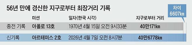 미국의 유인 달 탐사선 아르테미스2호에 탑승한 우주 비행사들이 56년 만에 인류가 지구에서 가장 먼 곳까지 가는 새 기록을 썼다. 미국 항공우주국(NASA)은 아르테미스 2호가 7일 오전 8시 7분(한국 시각) 지구에서 40만6778㎞(25만2760마일) 떨어진 지점에 도달했다고 밝혔다. 1970년 4월 아폴로 13호가 세운 기록(40만171㎞)을 6607㎞를 경신한 것이다. 아르테미스2호 우주선인 오리온에 탑승한 NASA 우주비행사 리드 와이즈먼(선장), 빅터 글로버(조종사), 크리스티나 코크와 캐나다우주청(CSA) 소속 제러미 핸슨 등 4명이 신기록의 주인공이다. 핸슨은 “인류가 도달했던 가장 먼 거리를 넘어서는 이 순간, 우주 탐사 선구자들의 업적에 경의를 표한다”며 “이 기록이 오래가지 않도록 다음 세대에 도전 메시지를 던지고 싶다”고 했다.
