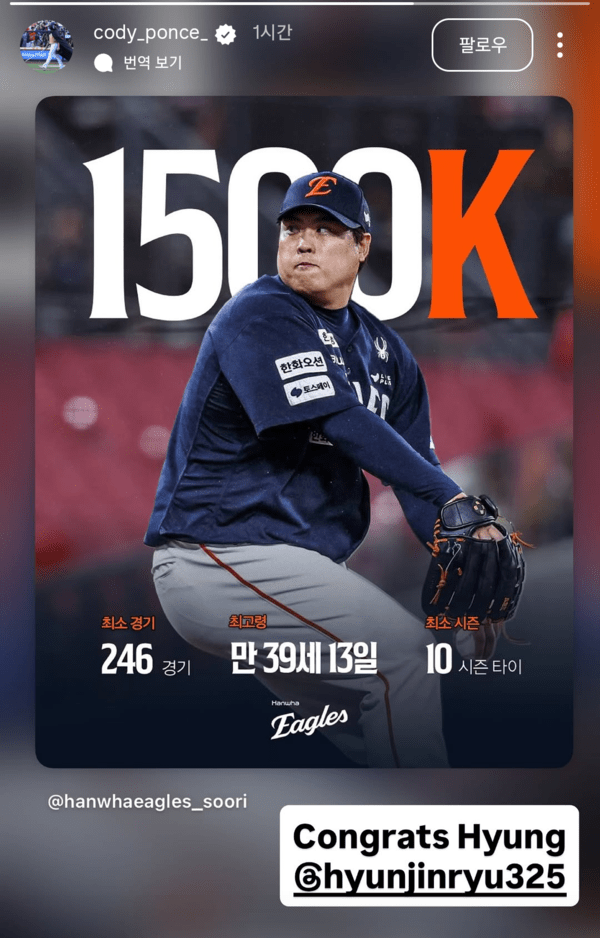 폰세는 본인의 SNS에 한화 구단 공식 계정이 올린 류현진의 1,500탈삼진 축하 게시물을 공유했다.