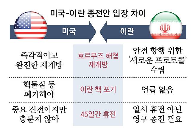 파키스탄 등 중재국들이 마련한 ‘45일 휴전안’에 대해서도 양측은 절충점을 찾지 못하고 있다. 트럼프 대통령은 6일 중재국들이 휴전 제안을 해온 사실을 인정하면서도 “충분하진 않다”고 했다. 이란은 영구적 종전이 이뤄져야 한다는 입장이다. NYT는 “파키스탄 등이 45일의 휴전을 제안했지만 이란은 일시적 전투 중단을 거부했다”고 전했다.