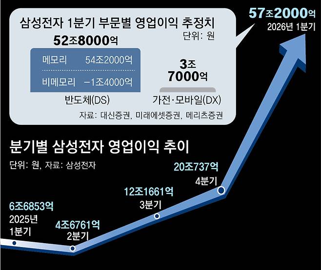 삼성전자가 이날 발표한 실적은 잠정치로 부문별 실적은 공개되지 않았지만, 이번 역대급 실적의 주인공은 단연 반도체라는 데 이견이 없다. 증권가에선 DS 부문에서만 52조∼53조 원대 영업이익을 낸 것으로 추정한다. 모바일, 가전, TV 등을 담당하는 DX사업부의 영업이익은 약 3조7000억 원으로 전망하고 있다.