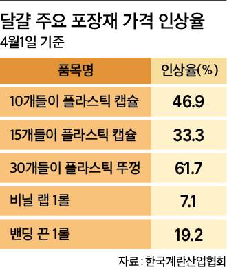 이 관계자에 따르면 30개들이 판포장품 ‘플라스틱 뚜껑’은 81원에서 131원으로 61.7% 올랐다. 10개들이 포장에 사용하는 ‘플라스틱 캡슐’은 64원에서 94원으로 46.9% 뛰었다.
