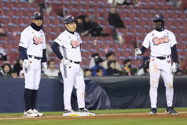 방망이가 무거우니 발걸음도 꼬였다. 2-3으로 피 말리는 추격전을 벌이던 6회말, 승부를 원점으로 돌릴 결정적 찬스가 주루 플레이 하나에 허무하게 날아갔다. 몸에 맞는 볼로 1루를 밟은 양의지는 다즈 카메론의 우중간을 가르는 큼지막한 2루타 때 2루를 돌아 3루로 향했다. 그러나 중간에 타구를 확인하느라 멈칫했다. 뒤늦게 전력 질주해 간신히 3루에 안착했지만, 이미 2루를 훌쩍 지나 3루로 향하던 타자 주자 카메론은 양의지가 멈춰 선 것을 보고 황급히 2루로 귀루해야만 했다.