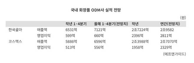 8일 금융정보업체 에프앤가이드에 따르면 화장품 제조자개발생산(ODM) 기업 한국콜마와 코스맥스의 1·4분기 연결 매출액은 각각 7121억원, 6596억원으로 전년 동기 대비 9%, 12% 증가할 전망이다. 영업이익은 8~10% 성장이 예상된다.