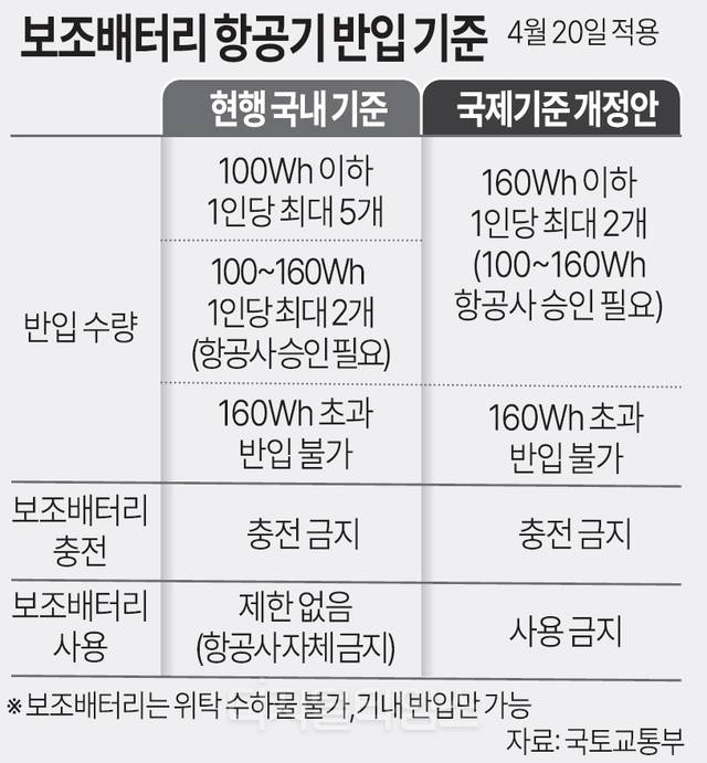 일본과 싱가포르, 홍콩 등 일부 국가는 이미 강화된 보조배터리 반입 기준을 시행하는 등 국가별로 규정이 조금씩 다를 수 있어 출국 전 항공사에 재차 확인할 필요가 있다고 국토부는 당부했다.