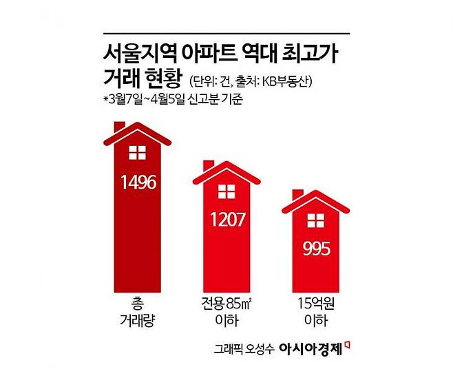 아시아경제가 KB부동산의 통계를 바탕으로 지난달 7일부터 이달 5일(신고일 기준)까지 신고된 서울 지역 아파트의 실거래 사례를 분석한 결과 이 기간 역대 최고가 거래는 총 1496건으로 나타났다.