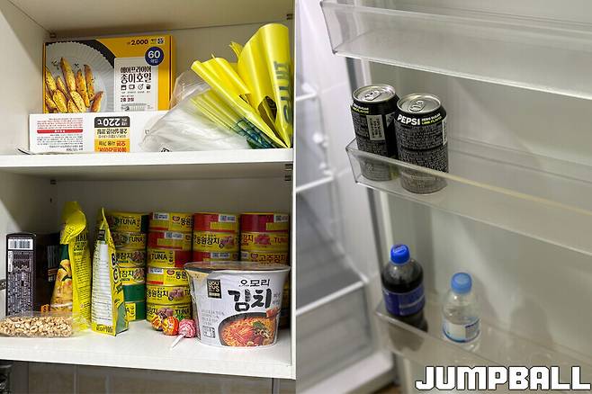 집 안 풍경은 꽤 현실적이었다. 자취방의 상징 같은 라면과 통조림이 차곡차곡 자리를 잡고 있었다. 보기만 해도 “아, 자취생이 사는 집이구나” 싶은 풍경이었다.