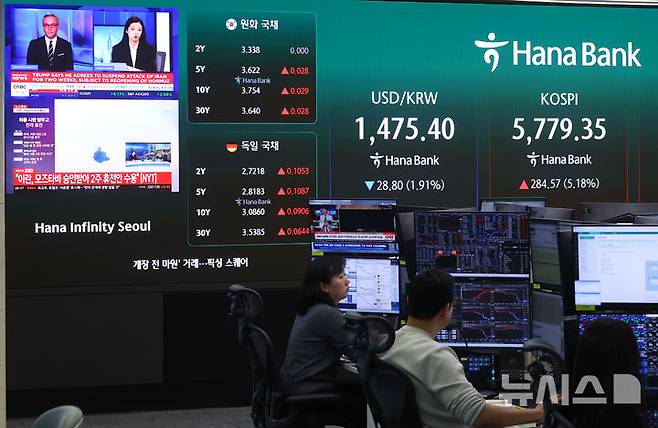 [서울=뉴시스] 황준선 기자 = 미국과 이란이 2주간 휴전에 사실상 합의한 8일 오전 서울 중구 하나은행 딜링룸에 코스피 지수와 원·달러 환율, 관련 보도가 송출되고 있다. 2026.04.08. hwang@newsis.com