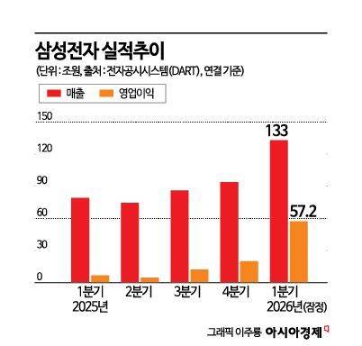 8일 산업계에 따르면 삼성전자는 전날 올해 1분기 연결 기준 매출액 133조원, 영업이익 57조2000억원으로 잠정 집계됐다고 공시했다. 매출은 지난해 동기 대비 68.1%, 영업이익은 755% 증가한 수치다. 분기 매출과 영업익 모두 역대 최대치로, 지난해 4분기 매출 93조8374억원, 영업이익 20조737억원이었던 역대 최고 기록을 다시 한번 넘어섰다. 이번 영업이익은 지난해 삼성전자 전체 영업이익인 43조6011억원을 1개 분기 만에 넘어섰다.