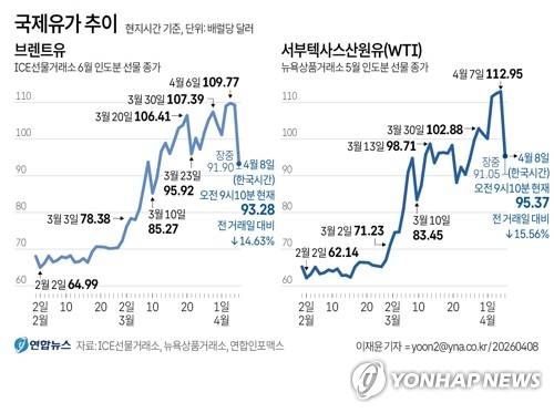 (서울=연합뉴스) 이재윤 기자 = 8일 오전 미국과 이란이 2주간 휴전에 사실상 합의하면서 국제 유가가 급락세를 보이고 있다.