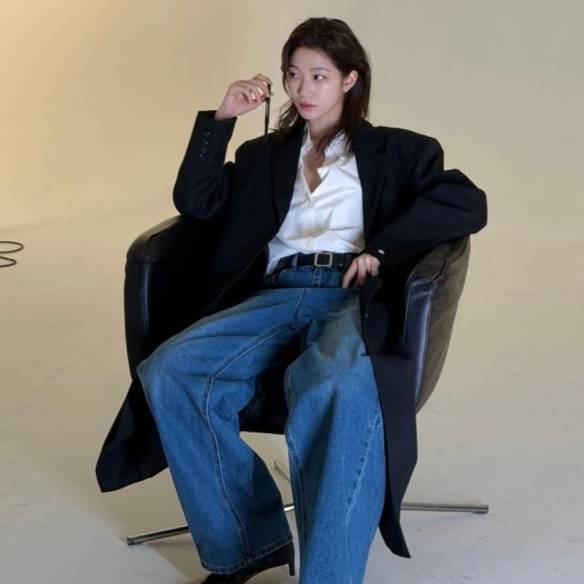 와이드한 중청 커브드 데님팬츠에 화이트 셔츠를 매치하고 슈즈로 스틸레토 부츠를 매치한 카즈하. 여기에 블랙 컬러의 오버핏 재킷을 걸쳐 시크하고 멋스러운 느낌을 더했어요. 자연스럽게 제품을 발라 마무리한 헤어까지 시크 그 자체.