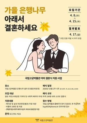 이번 사업은 국립고궁박물관의 가을 명소인 야외 은행나무쉼터를 혼례 장소로 무료 개방해 문화유산 공간에서 특별한 야외 결혼식을 올릴 수 있도록 지원하는 사업이다.