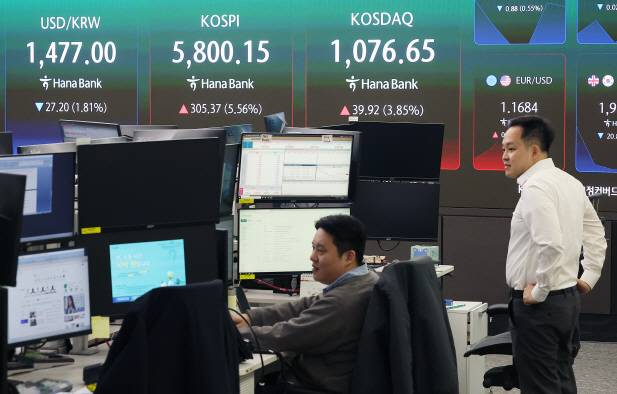 [8일 서울 중구 하나은행 본점 딜링룸 현황판에 원/달러 환율, 코스피, 코스닥 지수가 표시되고 있다. (사진=연합뉴스)]