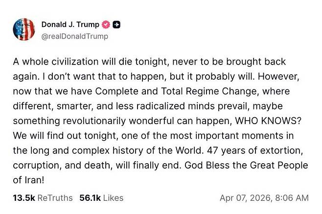 트럼프가 7일 오전 8시6분(현지시각) 트루스 소셜에 이란이 앞으로 12시간 안에 합의에 응하지 않으면 “오늘 밤 문명 전체가 사라지고 다시는 돌아오지 못할 것”이라는 최후통첩을 발했다.