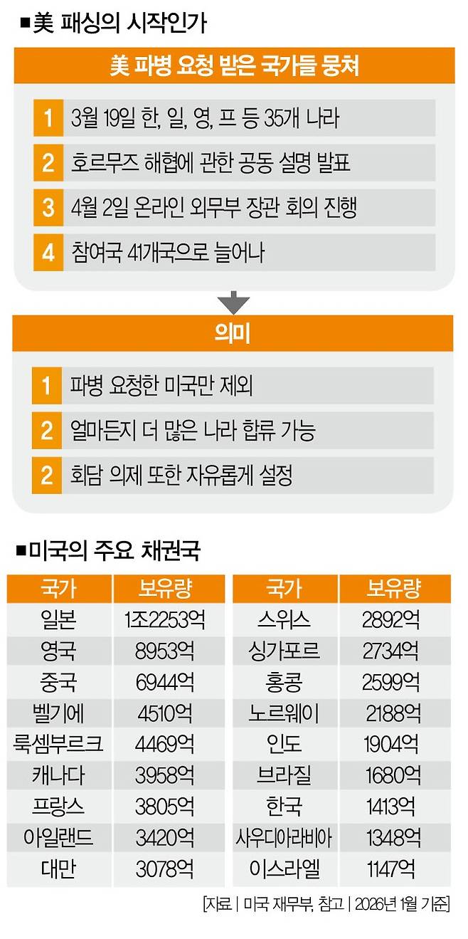 ■ 美 패싱하는 동맹국들=더스쿠프는 불필요한 파병을 방지하고, 미국을 압박해 전쟁을 끝내기 위해서는 트럼프가 파병을 요청한 한국, 일본, 영국, 프랑스 등이 모여서 최후의 수단으로 '미국 국채 매도' 등 모든 가능성을 고려할 필요가 있다고 보도했다.