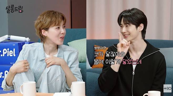이날 진행자 장도연은 "담벼락 키스신이 있지 않느냐"며 극 중 연인이 되는 변우석과 아이유의 스킨십 연기를 언급했다. 이에 변우석은 "입을 맞추면 코가 닿는다. 볼에 이렇게 닿았는데, 더우니까 코가 촉촉해서"라며 당시를 회상했고, 새어나오는 웃음에 말을 잇지 못했다. 이를 듣던 아이유가 변우석의 말을 마무리 짓기 위해 "볼에 이렇게 자국이"라고 말했으나, 그 또한 이내 웃음을 보이며 설렘 가득했던 현장 분위기를 짐작게 했다.