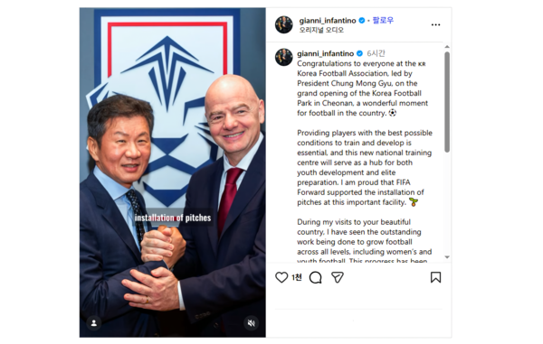 "한국 축구에 있어 정말 뜻깊은 순간" 인판티노 FIFA 회장, SNS 통해 코리아풋볼파크 개관 축하