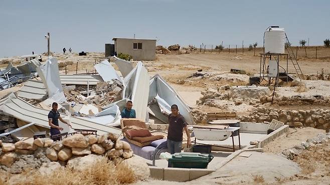 바젤이 기록한 영상들 속에서 이스라엘 군은 집을 철거하고, 우물을 메워 없애고, 전기를 끊는다. 사람이 더 이상 살 수 없는 조건을 만들어 스스로 떠나게 하는 방식의 폭력은 노골적인 전투가 아닌, 일상의 형태로 지속된다. 거대한 충돌은 없다. 대신 불도저가 밀어버린 집을 주민들은 밤 새워 다시 짓는다. 다시 집은 무너지고, 사람들은 다시 짓고, 또 다시 철거된다. 이 반복은 개별 사건이 아니라 구조가 되고, 폭력은 특정한 순간이 아니라 일상이 된다. 영화는 이 일상의 붕괴를 끝까지 보여준다.