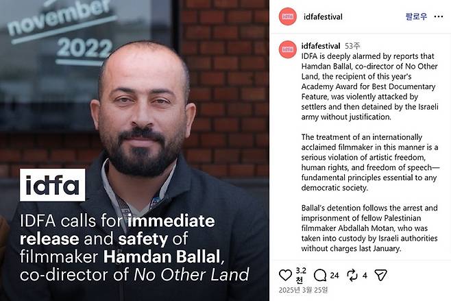 ▲ 2025년 3월, idfa(암스테르담 국제 다큐멘터리 영화제)에서 인스타그램에 업로드한 함단 발랄(Hamdan Ballal)의 석방을 촉구하는 이미지 게시물. |