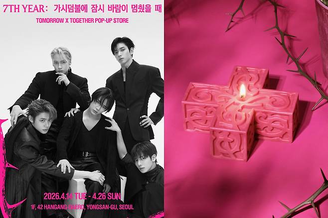 투모로우바이투게더(수빈, 연준, 범규, 태현, 휴닝카이)는 오는 14일부터 26일까지 하이브 용산 사옥에서 'TOMORROW X TOGETHER 7TH YEAR: 가시덤불에 잠시 바람이 멈췄을 때' 팝업 스토어를 개최한다.