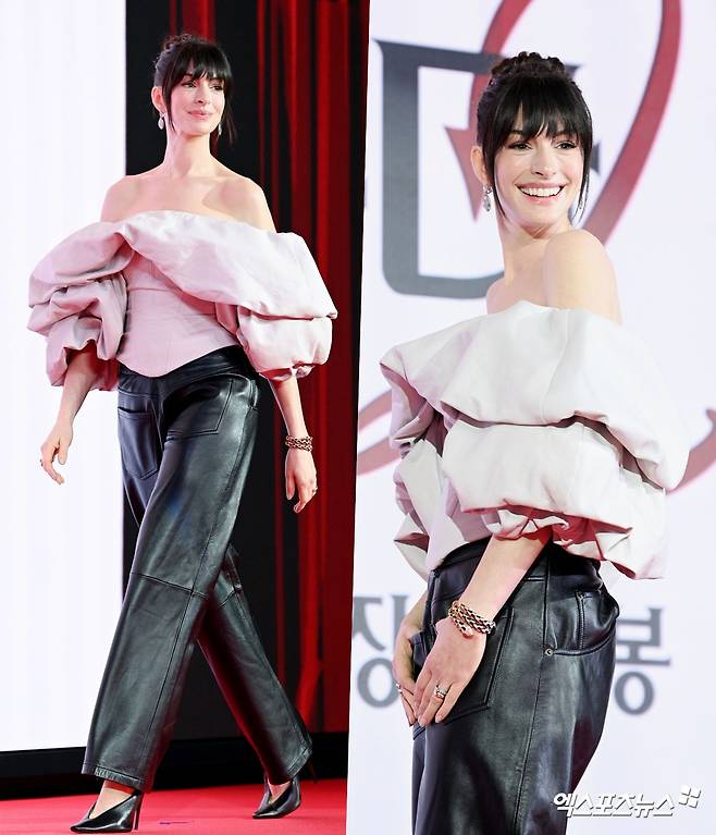 이날 앤 해서웨이는 과감한 오프숄더 디자인의 볼륨감 있는 블러시 톤 톱과 블랙 레더 팬츠를 매치해 클래식하면서도 현대적인 분위기를 완성했다.