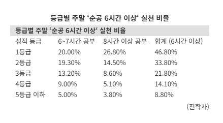 상위권과 하위권의 공부량 격차는 평일보다 주말에 5배 이상 벌어지며, 실제 성적을 올린 학생 10명 중 9명에 달하는 88.2%가 절대적인 학습량을 늘린 것으로 조사됐다.
