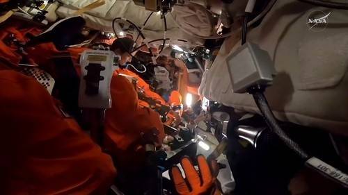 [미국의 유인 달 탐사선 아르테미스 2호의 승무원들이 미 동부 시간 기준 5일(현지시간) 새 우주복인 '오리온 승무원 생존 시스템'(OCSS) 착용 시험을 하고 있다. (미 항공우주국(NASA) 생중계 영상 캡처=연합뉴스)]