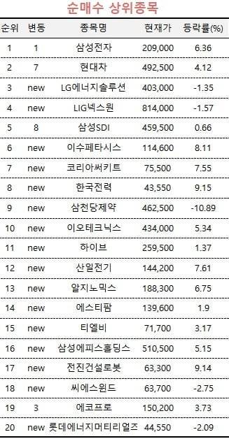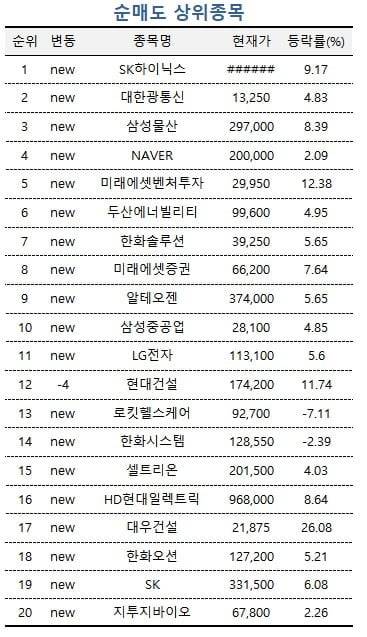 이밖에 삼성물산, 네이버, 미래에셋벤처투자 등이 각각 순매도 3~5위를 기록했다.