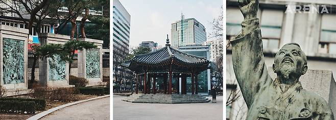 탑골공원은 서울 최초의 근대 공원이다. 대한제국 초대 황제였던 고종은 1897년 서양식 공원을 조성하라는 명을 내린다. 그 명을 받든 이는 중앙행정기관의 고문을 맡은 영국인 브라운. 그는 조선 세조가 원각사를 건립하였던 장소를 1920년 공원으로 탈바꿈시킨다. 공원의 본래 이름은 파고다공원이었지만, 1992년 탑골공원으로 이름을 바꾼 뒤 지금까지 이어오고 있다. 탑골공원에서 가장 눈에 띄는 것은 높이 12m에 달하는 원각사지십층석탑. 일반적으로 우리나라 석탑은 화강암으로 만들었지만 대리석을 사용한 것이 특징이다. 대리석은 화강암보다 풍화가 빠른데, 서울시는 1999년 훼손을 막기 위해 높이 15.4m 유리벽을 둘렀다. 탑골공원 팔각정 옆에는 소나무 한 그루가 심어져 있다. 이는 <전국노래자랑> MC이자 대구광역시 달성군 명예 군민인 송해가 주선하여 옮겨온 달성소나무다. 한동안 탑골공원 인근은 노인들의 바둑판으로 유명했지만, 2025년 여름부터 오락 행위가 전면 금지되며 그 풍경은 사라졌다.