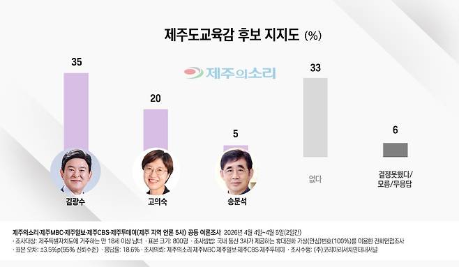 제주의소리를 비롯한 제주일보, 제주MBC, 제주CBS, 제주투데이 등 제주지역 언론 5사가 여론조사 전문기관 ㈜코리아리서치인터내셔널에 의뢰해 6일 발표한 2차 여론조사 결과, '내일 당장 선거가 치러진다면 누구를 지지하겠느냐'는 질문에 김광수 교육감의 지지율이 35%로 가장 높았다.