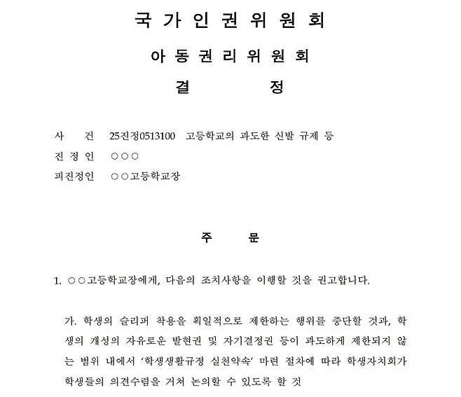 이에 대해 인권위 아동권리위원회는 학생생활규정 실천약속을 통해 학생의 슬리퍼 착용을 제한하는 것은 학생이 누려야 할 개성을 자유롭게 발현할 권리, 자기결정권 등을 침해할 우려가 있다고 봤다.