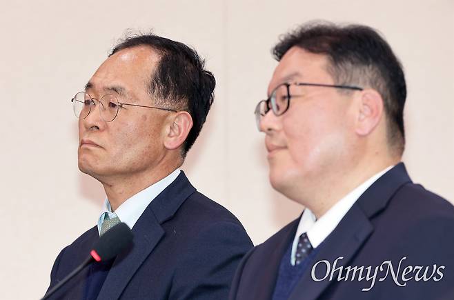 | ▲ 국정조사 증언대에 선 엄희준·강백신 검사 엄희준(오른쪽)·강백신(왼쪽) 검사가 7일 서울 여의도 국회에서 열린 '윤석열 정권 정치검찰 조작기소 의혹 사건 진상규명 국정조사'에 증인으로 출석해 답변하고 있다. 엄 검사와 강 검사는 '대장동 2기 수사팀'으로 대장동 개발 비리 의혹을 수사해 이재명 대통령 등을 기소했다. 김동아 더불어민주당 의원은 이날 엄 검사와 강 검사가 정식 인사 발령 이전 직무대리로 서울중앙지검에 부임해 사건 기록을 미리 들여다봤다는 의혹을 제기했다. |
