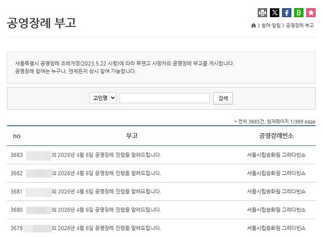 | ▲ 서울시립승화원 홈페이지에 게시되는 '무연고 사망자'의 부고 |