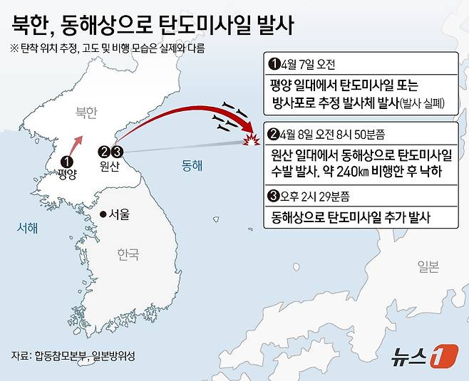 (서울=뉴스1) 윤주희 디자이너 = 합동참모본부(합참)는 이날 오후 2시 29분쯤 "북한이 동해상으로 미상의 탄도미사일을 발사했다"고 공지했다. 이날 오전 8시 50분쯤에도 동해상으로 단거리탄도미사일(SRBM)을 수 발 날린 것에 이어 오후에도 또 한 번 무력 도발을 감행한 것이다. 일각에서 제기되는 '적대적 두 국가론' 완화 기조를 차단하기 위한 의도로 풀이된다.