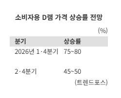 AI발 수요 폭증과 메모리 '빅3' 중 하나인 마이크론이 DDR4 생산을 중단하면서 메모리 가격 상승 압박은 이어지고 있다. 최근 PC용 D램 현물 가격 상승세가 주춤하고 있지만, 피크아웃(정점 후 하락)과는 무관한 일시 조정이라는 분석까지 나왔다. 트렌드포스는 올해 2·4분기 소비자용 D램 계약가격이 전 분기 대비 45~50% 상승할 것으로 예측했다. 구형 D램을 생산하는 대만 반도체 기업들은 3월 가격을 올리는 등 공급 부족을 지렛대 삼아 공격적 가격 정책을 펴고 있다.
