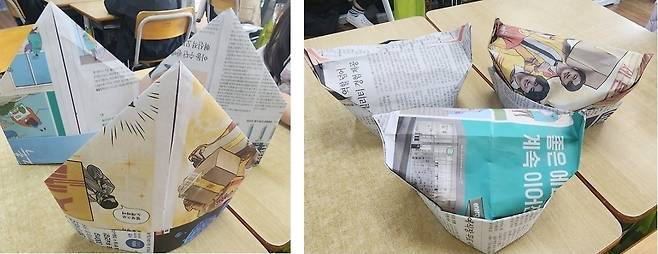 | ▲ 1학년 학생 두 명이 접은 학사모 신문지 한 장으로 여섯 가지 변신모자를 접고 마지막에 좋아하는 모자를 선택하게 하여 꾸민다. |