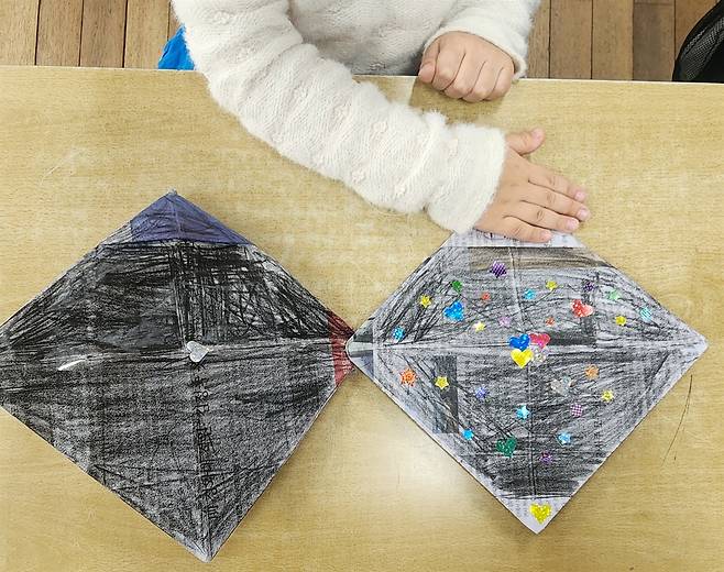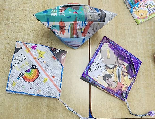 오늘 수업은 신문지로 '변신 모자 만들기'다. 이 수업을 할 때는 미리 신문지로 모자를 만들어서 선생님들이 각각 다른 모자를 쓰고 한 명씩 차례대로 교실에 들어간다. 신문지 모자를 쓴 할아버지, 할머니 선생님들(대부분 6, 70대 노인들)이 교실 앞문을 열고 들어가자 1학년 학생들이 신기한지 "우와!" 소리 지르며 손뼉까지 쳤다. 아이들의 환영이 어찌나 귀여운지 선생님 모두 웃으며 교실로 들어갔다.