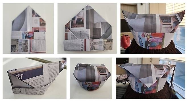 | ▲ 신문지 한 장으로 접는 변신모자 (위)도령모자, 교황모자, 도깨비모자 (아래) 세프모자, 해군모자, 학사모로 변신된다. |