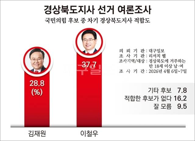 대구일보가 여론조사회사인 '리서치 웰'에 의뢰해 지난 6~7일 경북에 거주하는 만 18세 이상 남녀 1천4명을 대상으로 실시한 여론조사 결과, 국민의힘 후보 적합도에서 이철우 경북도지사는 37.7%를 기록해 김재원 최고위원(28.8%)을 8.9%포인트 차로 앞섰다.
