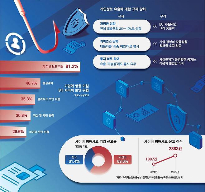 지난해 대규모 해킹 및 데이터 유출 사고가 다수 발생하자 정부는 2025년 10월 '범부처 정보 보호 종합대책'을 발표하고 올해 3월 그 내용을 담은 정보통신망법 개정안을 국회에서 통과시켰다. 오는 9월부터 이 법이 시행된다. 주요 내용을 보면 먼저 침해 사고의 반복적 발생에 대한 과징금 부과 규정이 신설됐다. 고의 또는 중과실로 침해 사고가 5년 이내 기간에 2회 이상 발생한 경우 매출액의 3% 범위에서 과징금을 부과할 수 있다. 또 침해 사고 조사 시 시정명령 불이행, 자료 미제출, 출입 또는 조사에 대한 방해나 기피 등에 대해 이행 강제금이 부과된다.