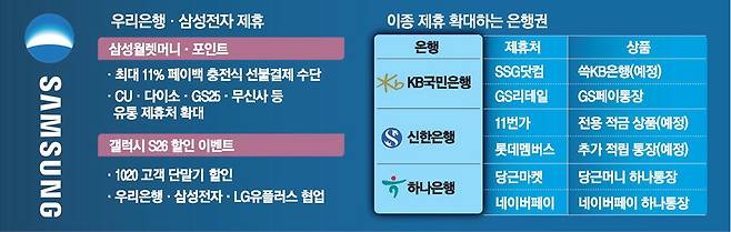 우리은행과 삼성전자의 '간편결제' 동맹이 확대되고 있다. 삼성전자의 휴대폰인 '갤럭시'에 탑재된 삼성월렛에 우리은행 계좌 등록을 결합해 충전, 출금, 결제, 할인까지 해주는 서비스를 내놓은 데 이어 갤럭시 휴대폰 구입 시 할인 혜택을 부여하고, 유통 채널인 다이소와 편의점 CU에서 해당 서비스를 이용하면 파격적인 포인트를 주는 방안도 추진 중이다.