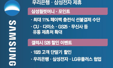 삼성전자의 휴대폰인 '갤럭시'에 탑재된 삼성월렛에 우리은행 계좌 등록을 결합해 충전, 출금, 결제, 할인까지 해주는 서비스를 내놓은 데 이어 갤럭시 휴대폰 가입 시 할인 혜택을 부여하고, 유통 채널인 다이소와 편의점 CU에서 해당 서비스를 이용하면 파격적인 포인트를 주는 방안도 추진 중인 것으로 알려졌다.