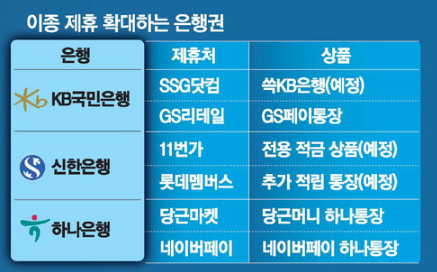 KB국민은행은 SSG닷컴과 손잡고 쇼핑과 금융을 결합한 최초의 금융 패키지인 ‘쓱KB은행’을 조만간 출시한다. 올 1월에는 GS리테일과 제휴를 맺고 계좌 간편결제 실적에 따라 혜택을 주는 ‘GS페이통장’을 내놓기도 했다. 국민은행은 지난해에도 스타벅스, 모니모 등과 연계한 통장을 내놨다.