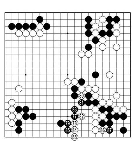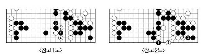 흑77로 위쪽 약점도 지키고 오른쪽 백 다섯 점에 공격을 알렸다. 오른쪽 백집이 아무리 커도 아래쪽이 다 흑집이 되면 백이 돌을 거둬야 한다. 강동윤은 백78에 붙였다. 흑79엔 80을 거쳐 82로 젖혔다. 백84로 늘고 88에 뻗자 천년만년 사는 돌이 됐다. 흑79가 아니라 <참고 1도> 1에 젖히면 백2로 끊어 살길을 연다. <참고 2도>를 보자. 백4가 두 집을 만드는 맥점이다.