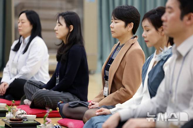 [서울=뉴시스] 조성우 기자 = 8일 서울 강남구 봉은사 보우당에서 열린 제2기 뉴시스 여성 CEO 리더십 아카데미 8회차에서 수강생들이 일감 스님(대한불교조계종 미래본부 사무총장) 진행으로 선명상 체험을 하고 있다. 2026.04.08. xconfind@newsis.com