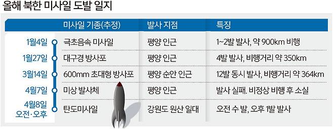 합동참모본부에 따르면 북한은 이날 오전 8시50분쯤 동해상으로 단거리 탄도미사일(SRBM) 수 발을 발사했고, 오후 2시20분쯤 동해상으로 탄도미사일을 발사했다. 오전에 발사된 탄도미사일은 약 240㎞를 비행한 후 동해상에 떨어졌다. 한·미 정보당국은 오전 발사된 탄도미사일을 ‘북한판 이스칸데르’로 불리는KN-23 계열로 추정하는 것으로 알려졌다. 북한은 전날에도 평양 일대에서 동쪽 방향으로 미상의 발사체를 발사했는데, 비행 초기에 이상 징후를 보이며 소실된 것으로 전해졌다.