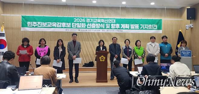 실제로 혁신연대가 지난달 30일 발표한 '2026년 경기민주진보교육감 단일후보 선출을 위한 경기교육혁신연대 참여단체 대표자 공동 선언문'(공동의 원칙)에는 "우리는 단일화 과정을 도민 누구나 참여할 수 있는 열린 과정으로 만들어 간다"라고 적시됐다.